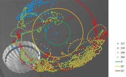 Vorticity is at the forefront of understanding of parachute physics and has developed simulation methods to predict inflation, aerodynamic performance, flight dynamics and trajectory prediction. Vorticity has developed key proprietary simulation softwares and analysis. The image on the left below show the point-wise tracking of a parachute in a wind-tunnel, and on the right, a visualisation from Vorticity's proprietary simulation visualisation software.