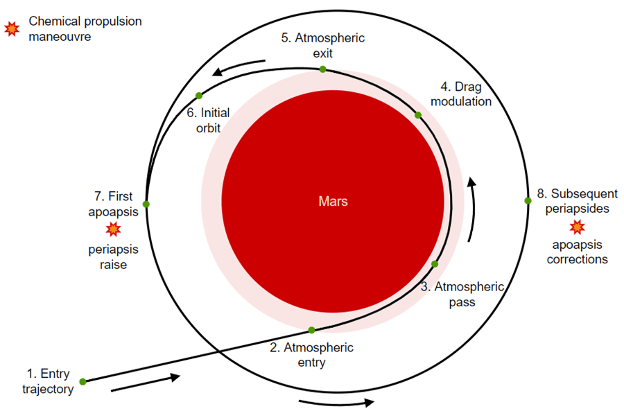 In the proposed aerocapture concept, the spacecraft uses an inflatable decelerator that is deployed as it enters the Martian atmosphere. The decelerator generates drag, slowing the spacecraft down. Midway through the atmospheric pass, the decelerator is jettisoned or retracted, increasing the spacecraft’s ballistic coefficient and giving it control over its final orbital apoapsis. After exiting the atmosphere, the spacecraft performs a periapsis raise manoeuvre to prevent a second atmospheric pass, then establishes communication with Earth and manoeuvres into its target orbit.