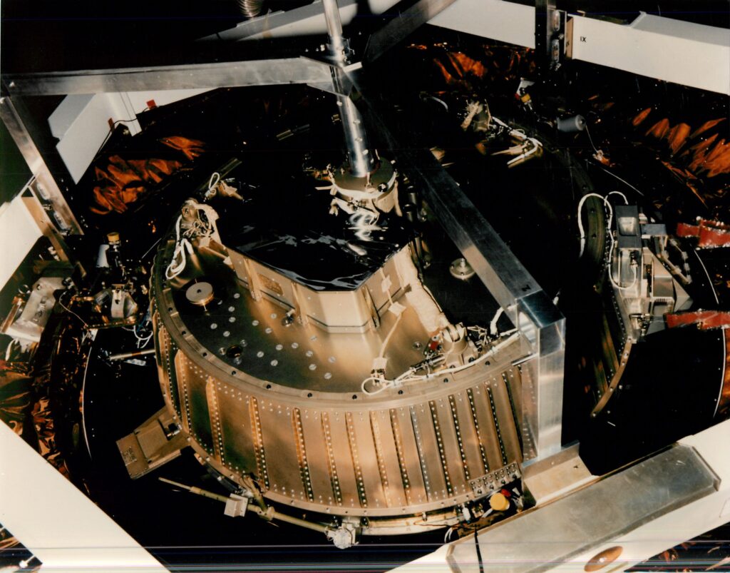 The Huygens lander, showing the parachute container and mortar on the centre of the rear face of the spacecraft